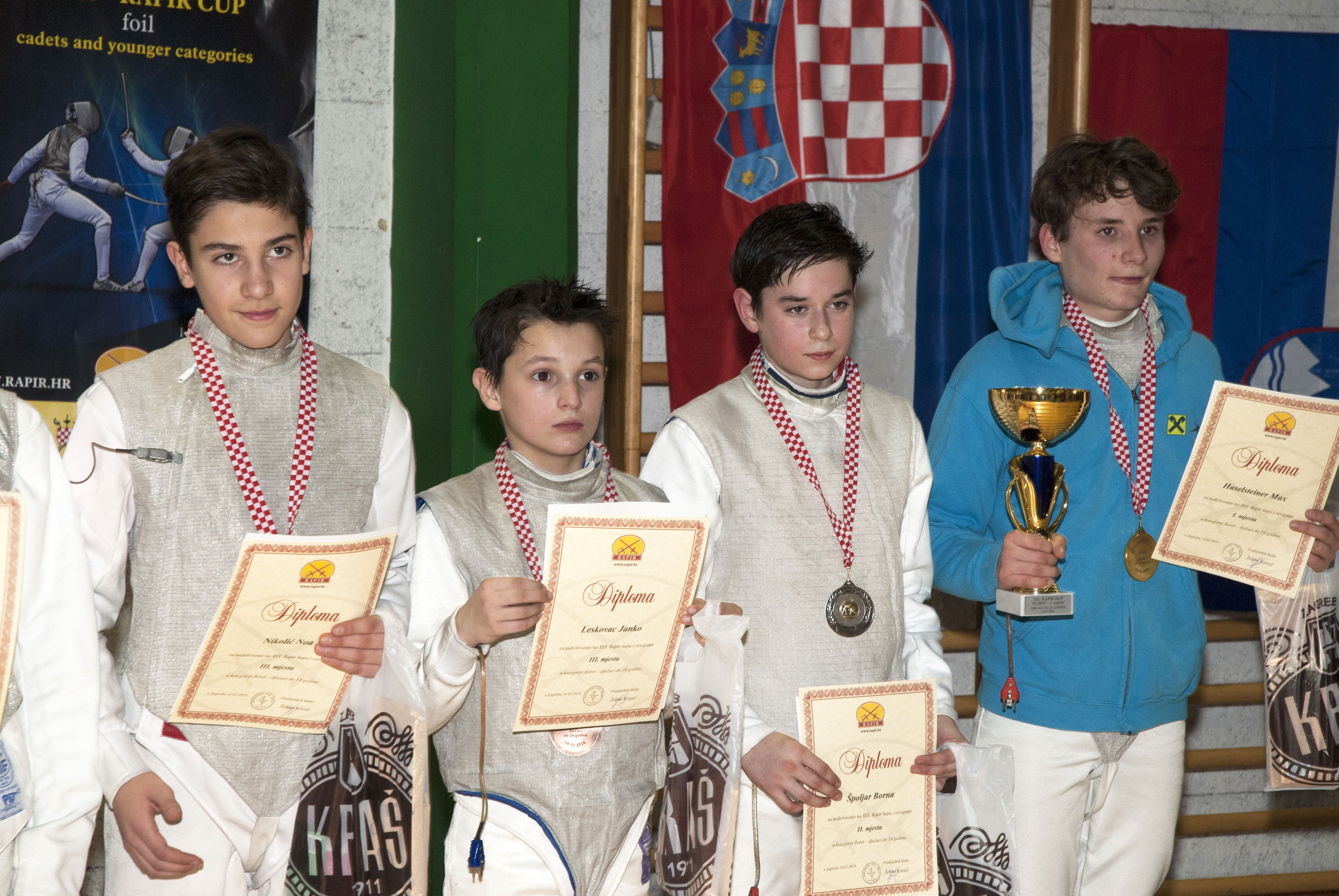 U floretu za mlađe kadete (do 14 godina) osvojene su 3 od 4 moguće medalje. Zlato je otišlo u Austriju (Max Haselsteiner), dok su naši podijeliji ostatak: 2.mjesto Borna Špoljar, a 3.mjesto Janko Leskovac i Noa Nikolić.